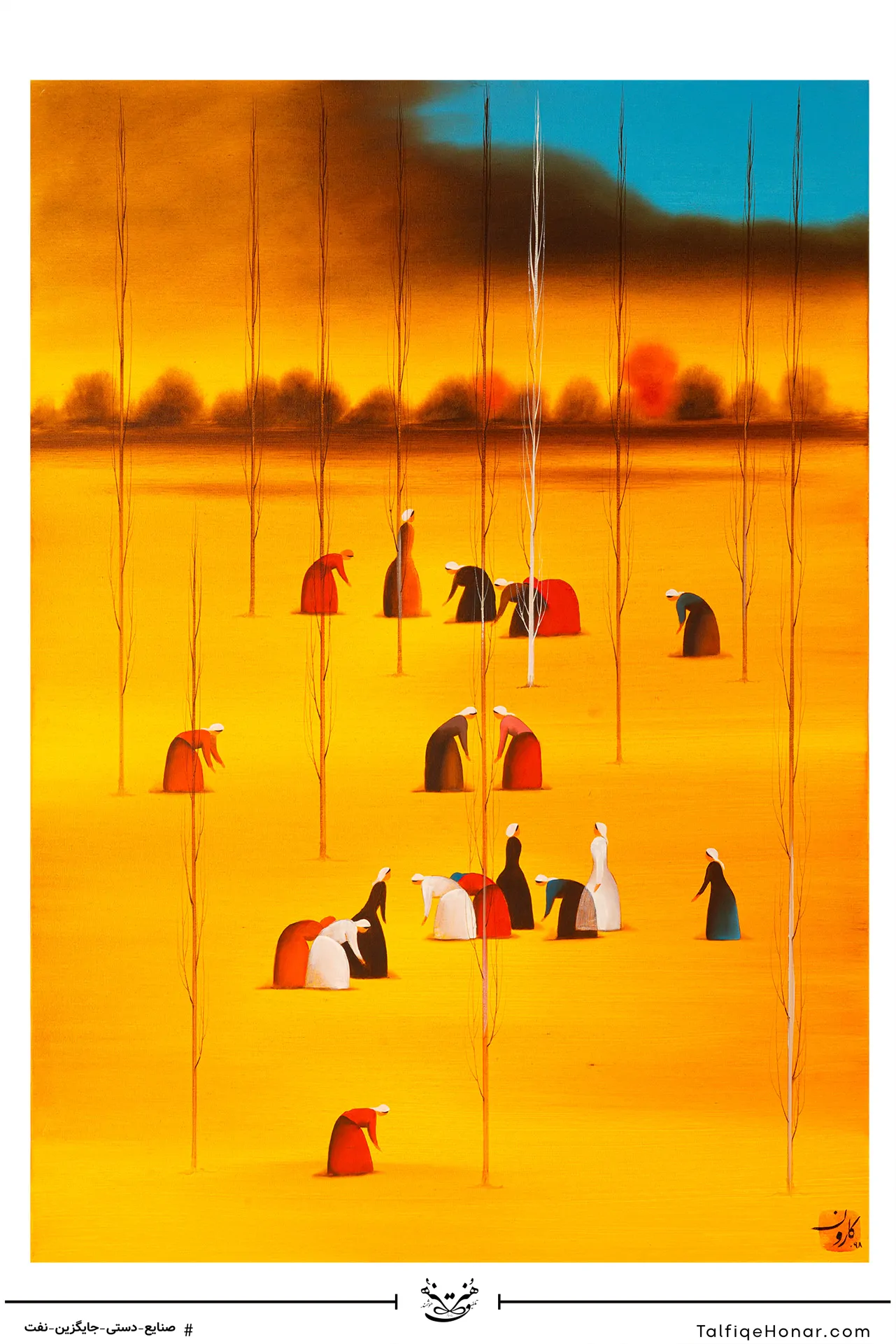 در این تابلو، مزرعه دیگر تنها یک منظره نیست؛ صحنهای است از همکاری و زندگی. زنان محلی با لباسهای رنگین و فرمهایی سادهشده، درون یک ترکیببندی فانتزی و دلنشین، مشغول کارند. هنرمند با قلمی مینیمال، از زندگی روزمره یک قصهی بصری ساخته است؛ قصهای که در آن، سادگی و اصالت، در پوششی از رنگ و خیال تجلی یافته است. این نقاشی، یادآور میشود که زیبایی در کار و هماهنگی انسان با طبیعت، میتواند زبانی جهانی و امروزی داشته باشد.