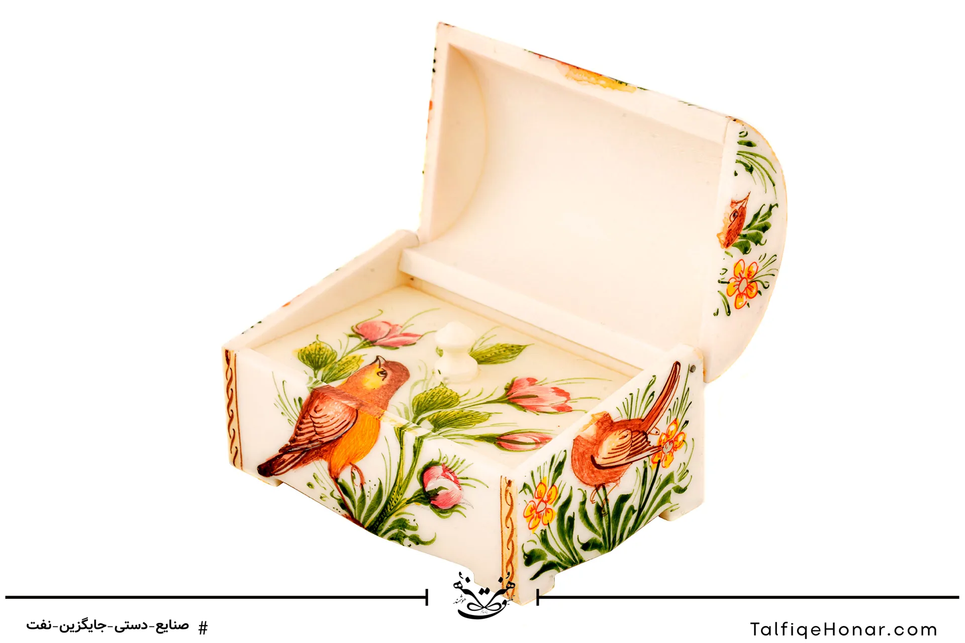 این جعبه کوچک استخوانی، بیش از یک ظرف است؛ گویی خانهای نمادین است که رازهای کوچک و گرانبهای شما را در خود پناه میدهد. نقاشی زیرلاکی بر روی آن، با ظرافتی مثالزدنی، تصویر گل و مرغ سنتی ایرانی را ترسیم کرده که یادآور گرمای کانون خانواده و آرامش حریم شخصی است.